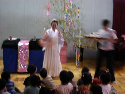 空の天の川から,おりひめ様が翔鸞幼稚園へやってきました。なんと美しくきれいなのでしょうか。みんなが思わず息をのみました。