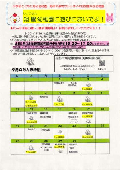 9月の幼稚園説明会とたんぽぽ組(未就園児クラス)のお知らせ