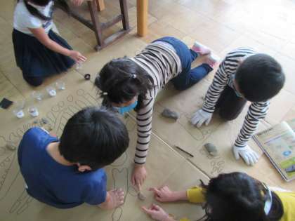 昨年度のそら組さんが「翔鸞幼稚園の砂場は大昔,海だった!」と言っていたのを,現そら組の子どもたちは覚えています。だから,子どもたちにとって翔鸞幼稚園の砂場はただの砂場ではありません。色々な怪しいものが埋まっている,特別な砂場です。砂場から出てきた石を,「化石や!」と化石に見立て,研究をしています。見つけた化石が増えてきたので,「恐竜をつくりたいねん」とAくん。今日はその化石が,恐竜のどこの骨なのか,当てはめていきました。「これは丸いし,ひざの骨や!」「これとこれくっつけたら,足の骨の形になる!」「これ,歯の形に似てる!」と子どもたち。少しづつ,恐竜の骨が集まってきています。