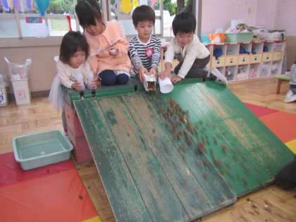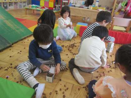 昨日,北野天満宮にみんなでドングリ拾いに行きました。タライいっぱいのドングリを拾って帰ってきて,今日は部屋中ドングリだらけにして遊びました。坂道をつくると,たっぷりのドングリを一気に転がしたり,転がる時の音を楽しんだりしていました。遊びながら思わず♪どんぐりころころ どんぶりこ〜♪と口ずさむ子ども達でした!