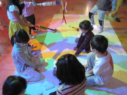 今日は,つくるまなぶ京都町屋科学館の皆様にお越しいただき,そら組の子どもたちが光と影のとってもわくわくする体験をさせていただきました。いつもの遊戯室の照明を3色の光のライトに変えると…自分や友達の,カラフルな影があちこちにたくさん…!早速色々なポーズをとったり,近づいたり離れたり…。「これはどんな影が映るかな?」と試したり,画用紙やセロハン紙で自分で色々なものをつくって試したりもしました。「影が重なったら色が変わるの。」「虹色の影もできたよ」「ペットボトルが分裂してるみたいだった」と,色々な発見をしながら楽しんだ子どもたちでした。つくるまなぶ京都町屋科学館の皆様,本当にありがとうございました!