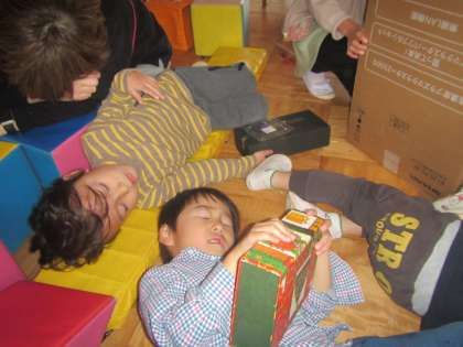 部屋で遊んでいると,シャンシャンシャンシャン・・・と,鈴の音が聞こえてきました。“トナカイ”と“魔法使い”のそら組の子ども達が「みんなー,寝て待ってくださいよー!」とお知らせをしに来てくれました。廊下には,そりに乗った,そら組サンタさんの姿が・・・!大急ぎで,積み木のお家の中で眠り始めたひかり組の子ども達。一人ずつにサンタさんが,そっとプレゼントを置いていってくれました。包み紙を開けると,かわいいネックレスが入っていました。「やったー!!!!」と,大喜びの子ども達でした!