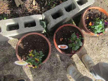 トナカイさん「何やってるの?」 先生「今から,チューリップの球根とビオラのお花を植えようと思って準備してるんだよ」と言うと,「やりたーい!!」と,元気いっぱい,やる気満々のトナカイさんたち。早速,植木鉢に土を入れて,球根と苗を植えると,最後に・・・なんと!ドングリも一緒に植えていました。「あー,はやくお花とドングリができるといいなぁ」と,期待に胸を膨らませるトナカイさんたちでした。
