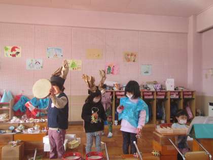 先日,ピアノをつくっていたAくんとBくんが,「先生〜,楽譜がつくりたいねん」「先生がいっつもピアノ弾いてる時みてるやつ見して!」と言いました。「楽譜ね!どの曲がいい?」と一緒に楽譜を見ていると,「これやな!これにしよ!」と,白い紙にいつも歌っているクリスマスの歌の楽譜を書き始めました。完成すると「よし!これでいい!」とピアノの前に置きました。すると「ここの歌の時に鈴ならしたらいい!」とCちゃんが言いました。Dちゃんが「じゃぁ,お客さんも呼ぼう!」と言いました。さっそく音楽会の準備が始まりました。とっても面白かったのは,お客さんの椅子です。椅子をひっくり返して置き,ホールや映画館のような椅子を再現していました。お客さんを呼びに行き,自動販売機のジュースやケーキでおもてなしをして,クリスマス音楽会が始まりました。ピアノや鈴,タンブリン,カスタネットで楽器演奏したり,「僕たちサンタさんやから隠れて見えないようにしよう!」と隠れて演奏したり,とっても楽しい音楽会でした。