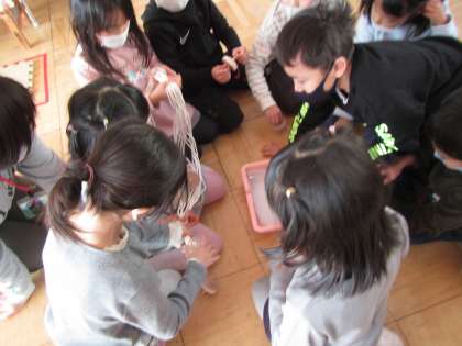 登園後,「あけましておめでとうございます!」と元気にあいさつし,友達や先生との再会を嬉しく思う姿がたくさんありました。始業式では,「どんなことにも”トラ”イする1年に!」というお話を聞きました。楽しみにしていたお年玉をもらい,みんなであけてみると,コマが入っていました!そら組では,前のそら組さんの姿を思い出したり,友達からの刺激を受けたりしながらコマ回しに早速トライ!しました!