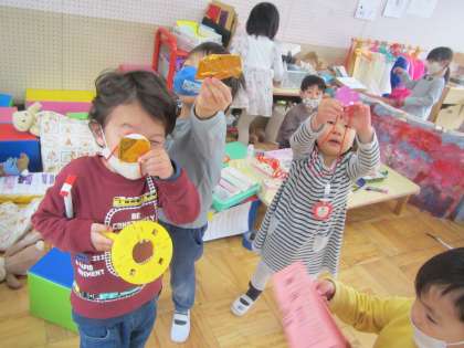 先週末から,始まったこの遊び。組み立てたブロックをストーンに見立てて,目的の場所まで滑らすことをたのしんでいました。きっと北京オリンピックからの刺激なのでしょうか?子ども達から生まれる遊びの面白さや楽しさを毎日感じさせてもらっています!金メダルや銀メダル,オリジナルのピカピカメダルもつくって,にこにこ笑顔の子どもたちです!