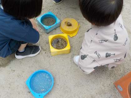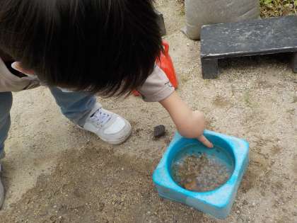 幼稚園の水瓶をのぞいていたそら組のAくん。すると…「ヤゴいた!!」と大きな声!ヤゴを2匹発見しました!にじ組の時もヤゴを見つけたけれど,うまく育ちませんでした。「ヤゴの食べ物はリンゴやねん」「にじ組の時はリンゴをあげすぎて死んじゃった」「だからな,これは細切りにしてあげるねん」「そうそう。小指くらいにな!」と,AくんとBくん。「クラスのみんなに伝えたい!」と,お弁当の前にみんなに伝えると,「トンボになってほしい!」とそら組のみんな。ヤゴの研究が始まりそうです。
