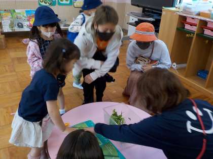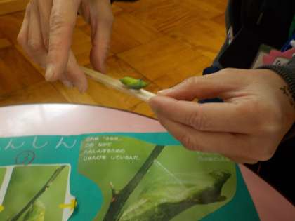 はらぺこアオムシが,なんとサナギに変身しました!「あっ!顔がなくなってる!」「糸でくっついてる!」と子ども達。その声を聞いて,お家の方も興味津々でお部屋に見に来てくれました。しかし,その時です・・・一匹行方不明になっていたアオムシがサナギになってロッカーの横に落ちていたのです。「どうしよう」「死んでしまうの?」と心配そうな子ども達。先生が,昔,子どもの頃同じようなことがあって,その時の先生が「割り箸にボンドでくっつけてあげたら大丈夫なんだよ!」と教えてくれたことを思い出し,やってみることにしました。今,飼育ケースの壁にくっついているサナギの様子を子ども達と一緒によく見て,同じ方向になるように慎重にボンドでくっつけてあげました。サナギさん,元気にちょうちょうになってね!!!会えるのを楽しみにしているよ!!