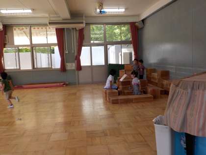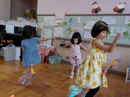魔女ごっこが大好きなにじ組の子ども達。何やら,魔法のほうきに乗ってお出かけする様子。行先はまじょまじょランド。まじょまじょランドではパーティーをしたり,鬼ごっこをしたり!しばらくするとダンスショーも始まりました。魔法の呪文は「あぶらかたぶら ちちんぷいぷい 〇〇になぁれ!おしりぺんぺん!!」なんですって!明日は,どんなまじょまじょランドになるのか楽しみです!