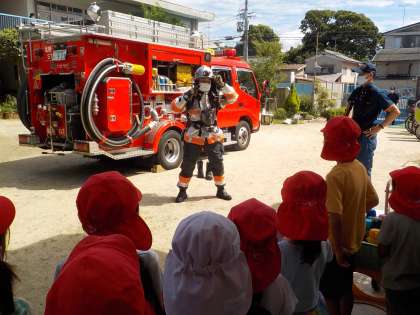 幼稚園に消防車が来てくれました。消防士さんが,ゆっくり,じっくり消防車の中を見せてくださったり,実際の運転席に乗せてくださったりしました。大喜びの子ども達!「大きくなったら,消防士さんになる!!」という声も聞こえてきました。