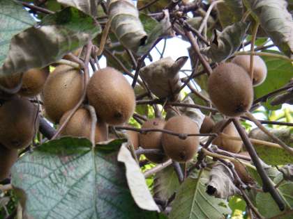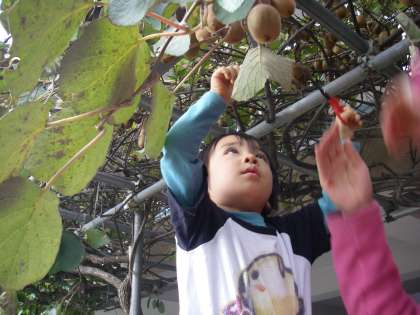 幼稚園職員室前のキウイが収穫期を迎えました。子ども達が収穫を開始しました。手前の低いところのキウイを一人一人がもぎ取ります。今年はよく成る年に当たるようで収穫が楽しみです。子ども達はお家に持って帰ります。