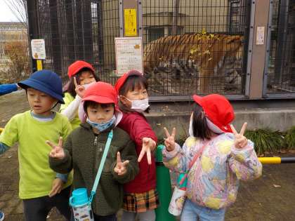 昨日、全園児で動物園に園外保育に行きました。動物園では、クラスの先生やお友達と一緒に色々な動物を見ました。そら組の子どもたちは、地図を見ながら、「ここに行こう!」「この動物を見たい!」と相談しながら園内を回りました。そして、動物園の飼育員さんにトラについてのお話を聞いたり、トラについて聞きたいことを質問したりし、耳の模様のこと、トラの模様のこと、手のこと、牙のこと、トラの好きなものなど、色々なことを教えていただきました。昨日の経験から、今日は動物園のトラをかきました。昨日のお話を思いながら自分なりのトラを力いっぱい表現していました。