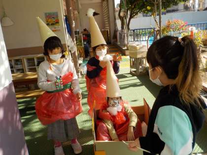 大きなツリーを飾ったり、自分のクリスマスツリーをつくったりしながらクリスマスを楽しみにしているそら組の子どもたち。幼稚園のみんなにプレゼントをつくってあげたい気持ちになっていました。そして、サンタの帽子や服をつくりはじめました。サンタが乗るソリもつくりました。ひかり組さんに「ほしいものはなあに?」とこっそり聞き、プレゼントをつくり、いざ出発!「寝てくださ〜い!」と言うと、ひかり組のお友達はちゃんと目を瞑って寝てくれました。そして、プレゼントを置いて「メリークリスマス!」とワクワクしながら保育室を出ました。その後、「素敵なプレゼントあったの」と言われても「なんのこと?」と知らないふりをしたそら組のサンタたちでした。プレゼントを待っているお友達は、まだまだたくさん!サンタ工場は忙しくなりそうです!