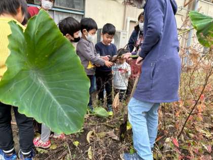今日は,3歳児と4歳児で里芋の収穫をしました。大きな葉っぱは,まるで傘のようでした。そして,土の中から出てきた里芋は,なんと40個!!「早くたべたいなぁぁ」という声が子ども達から早速聞こえてきました。また,皆で体がホッカホカに温まるおいしいお味噌汁にして食べてみたいですね!お楽しみに!!