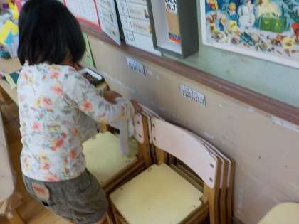 絵本『ぐりとぐらのおおそうじ』を見た子どもたちは、「ひかりぐみのおおそうじ」を始めることに。ぐりとぐらのように腕まくりをして、やる気満々です。「下ぞうきん(床拭き)する!」「椅子も拭こうよ」「ごちそうも洗おう!」と、きれいにしたいところを自分たちで考えました。拭き掃除を頑張る子どもたちは、だんだん黒くなっていくぞうきんを得意そうに見せてくれました。自分たちの力でお部屋がきれいになって、とっても誇らしそうな子どもたちでした!