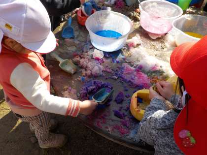 その後は,雪のお団子屋さんが園庭でオープンしました。味付けをしたくなった子どもたち。色水を雪にかけると,なんとまあ,美しい雪のお団子に大変身。夏の色水遊びも楽しいけど,冬の色付き雪遊びも楽しい一日でした!