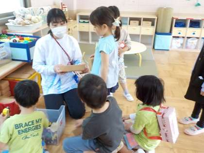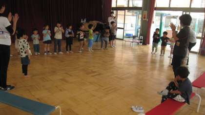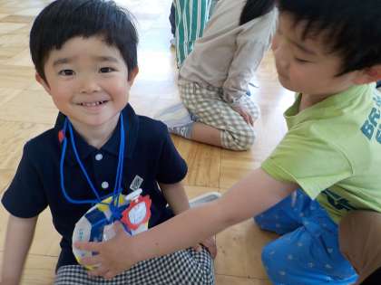 火曜日、ひかり組さんの初めての身体測定をお手伝いしてくれたそら組の子どもたち。「もっと新しいお友達と仲良くなりたい!」と、お迎え会を開くことになりました。「一緒にどんなことしたいかな」「ブランコ一緒にしたい」「ダンスもしたい」「幼稚園のこといっぱい教えてあげたい」など、色々な考えがでてきました。話しあった結果、みんなで体操をし、プレゼントを渡すことに。昨日一生懸命プレゼントの準備をし、今日、お招き会を開きました。ちょっぴり緊張気味に、でも嬉しそうにしていた新入園児のお友達。喜んでもらってそら組の子どもたちも嬉しそうでした。これからいーっぱい一緒に遊べるのが楽しみですね!