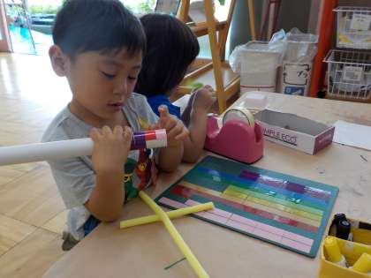 おばけちゃんに毎日ごちそうを届けているひかり組の子どもたち。朝、おばけちゃんからお礼やお願いのお手紙が届いているか確かめに行くのが日課となっています。今日の手紙には、「明日から冒険の旅に出かける」と書いてありました。子どもたちは「えー!」とびっくり。冒険に必要なものがほしいおばけちゃんに、お弁当と剣をつくることにしました。お弁当には、玉子焼きや梅干しおにぎりを入れました。剣は、おばけちゃんの好きな色は何かを考えながらつくっていました。完成したお弁当と剣をおばけちゃんのもとへ届けて、「明日、元気に出発してくれるかな?」「おばけちゃん、どこへ行くのかな?」と、思いを募らす子どもたちでした。