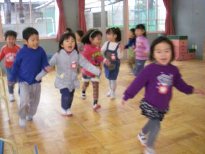 今日は朝から久しぶりの雨です。寒波の中休みとでもいう少し暖かい感じです。年少さんは遊戯室でダンス遊びをしました。