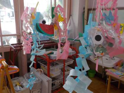 ひかり組は今日、親子で七夕飾りをつくりました。幼稚園では初めて、自分ではさみを使いました。真剣な表情で、カラフルな紙をチョキン、チョキンと切ってお魚さんをつくったり、天の川が切れてしまわないように、慎重に切ったり…。おうちの人と力を合わせて、素敵な七夕飾りが出来上がりました。吊るしてある飾りを眺めてみたり、ジャンプして触ってみたりと、自分の七夕飾りが嬉しくてたまらない様子でした。みんなの願い事、お星さまに届くといいね!