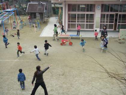 外では追いかけっこやジャングルジム遊びなど,部屋では「みいつけた」かくれんぼをしています。みんなで一緒に遊ぶと楽しいね。