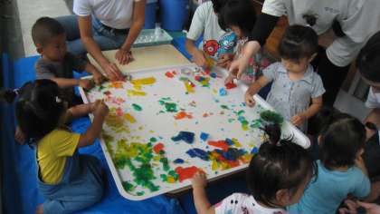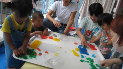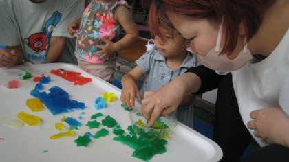 今日は,たんぽぽ組(未就園児親子クラス)で寒天遊びをしました!赤・青・黄色・緑色の食紅で色をつけたプルンプルンで冷たい寒天!!触ると,なんともいえない,気持ちのいい感触!!指でツンツンしたり,グニューとつぶしたり,カップにいっぱい集めてみたり,思い思いに好きなことをして遊びました。気が付くと1時間程遊んでいましたね!