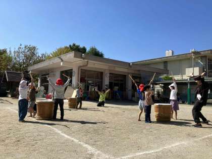 今日もとてもいい天気!!空は気持ちの良い青空!!そら組の子ども達の,『力を合わせてラッセーラ!』の樽太鼓の音も響き渡っています!