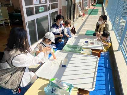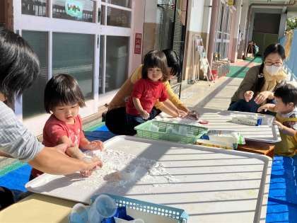 今日は,たんぽぽ組で「片栗粉」を使って遊びました。サラサラの片栗粉は,手で触るとスベスベしてるけど,ギュッと握ると固まる不思議な粉。子ども達だけではなく,お家の方も「気持ちいいねー!」「いやされるわー!」と,楽しいひと時を過ごしました!遊びの最後は,みんな真っ白けだったね!