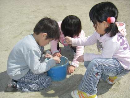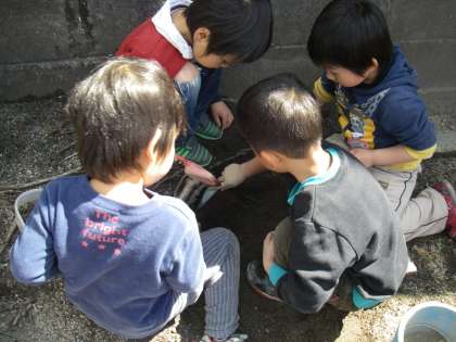 子ども達は園庭の石を拾ったり遊んできたおもちゃや遊び道具をきれいにしました。「先生,石があるとあぶないしな。ウサギが怪我したらかわいそうやしな」と言いながら石を拾っていました。