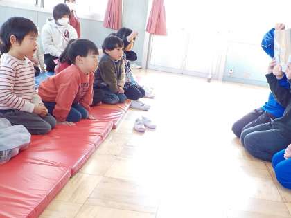 今日はお別れの日です。最後に、一緒に遊んだり、紙芝居を読んでもらったりしました。一緒にたくさん遊んで、とっても楽しかったね!中学生の皆さん、ありがとうございました。
