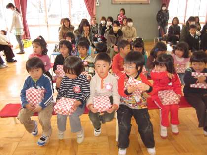 今日は平成23年度3学期終業式でした。終業式では、先日の修了式の年長児のように、園長先生から、一人ずつ演台の前にでて進級記念品をもらいました。みんな1年の間に心も体も大きくなりましたね。