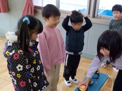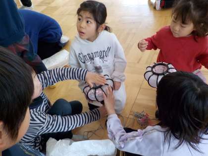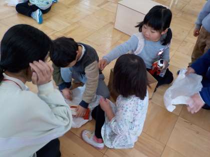 もうすぐ3月。お雛祭りがやってきます。幼稚園でも遊戯室に雛人形をみんなで飾りました。そーっと、そーっと…覆っていた紙から出します。そして「これはどこに置くのかな?」飾る位置のわかる写真と人形を見比べて飾ってきました。最後にぼんぼりに明かりをつけて完成!素敵な雛人形を飾ることができました。