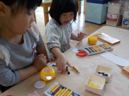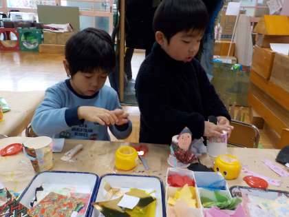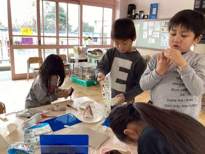 ♪あかりをつけましょ ぼんぼりに〜♪と、歌いながら楽しく雛人形をつくりました。「こんな形の冠はどう?」と自分で工夫して切ってつくってみたり、いろいろな材料を使って「こんなんできた!」と新たな発見をしながらつくりました。