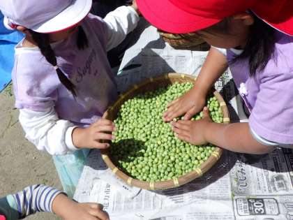 今日、エンドウマメを収穫しました。「あったー!」と、マメを見つけるたび嬉しそうな子どもたち。マメを見つける名人や、マメをむく名人がたくさんいましたね。「めっちゃいっぱいあるなあ、大変や!」と言いながらも、みんなで力を合わせて全部むきました。量ってみると…なんと2.6kg!「これで豆ごはんがつくれる!」と大喜びでした。豆ごはんパーティー、楽しみだね!