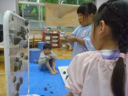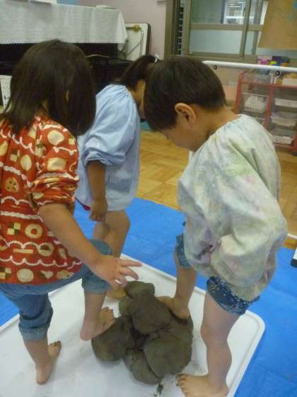 ひかり組にとっては初めての土粘土との出会いでした。大きな塊にびっくりしながらも、足で踏んでみたり、指先を使ってちぎってみたり、と思い思いに遊び始めました。