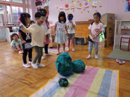 昨日、「スイカ割りしたい!」とひらめいた子どもたち。「この柔らかい紙を赤と緑にして、丸くすればいい!」と自分たちで考えて、スイカをつくりました。目隠しやスイカを割るための棒もつくりました。「スイカ割りができますよー!」とひかり組の友達に宣伝をし、スイカ割り屋さんがオープンしました。目隠しをつけて、いざチャレンジ!最後には、みんなの力でスイカが割れ、真っ赤な果実が現れました!自分たちの考えた遊びをひかり組の友達と一緒に楽しむことができて、満足気なにじ組の子どもたちでした。
