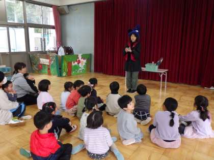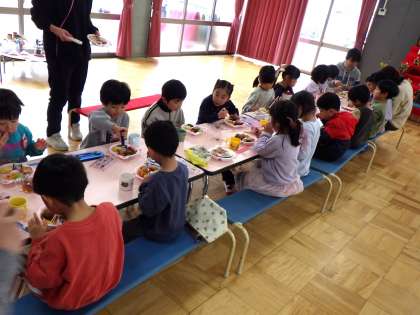 今日はあいにくの雨でしたが、遊戯室では素敵なこどもお別れ会が開かれました。あと少しでお別れのそら組さん。「幼稚園でいちばん心に残っていること」を話してもらいました。「カブトムシと遊んだこと」「竹馬にチャレンジしたこと」「帽子取りををしたこと」など、心に素敵な思い出がたくさん残っていることが伝わってきました。そして、幼稚園のみんなで仲良し遊びをしたり、園長先生のマジックショーを見たりして、楽しい時間を過ごしました。お昼ごはんは、スペシャル弁当!みんなで食べるととってもおいしかったね!