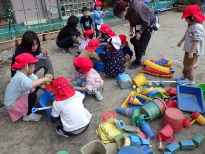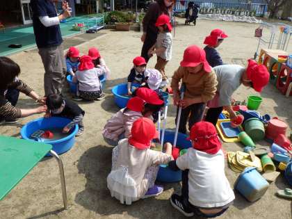 あと1日で、終業式です。今日は、これまでたくさん使ってきた砂場のおもちゃを洗いました。「一緒に運ぼう」と、砂場からせっせとおもちゃを運びました。みんなで力を合わせると、どんどんピカピカになっていきましたね。これで、気持ちよく新年度が迎えられそうです。