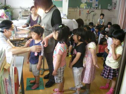 よし,今日もと検診を受けました。年少さんは何人か泣いて受けられませんでした。まだ初めての鼻や喉ですから無理もありません。年中さんからは,「年中さんや年長さんになると貫禄が出るね。賢く受けられるね」と耳鼻科医の先生に褒めてもらいました。