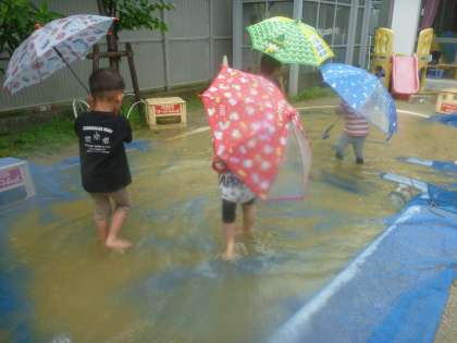 この時期ならではの雨の音を感じ、たくさんの水の感触を味わったり、自分なりに試したり、友達の発見を一緒に楽しんだり…、このような姿を大切にしたいです。