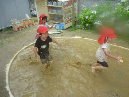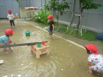 今日は朝からいいお天気!早速砂場の様子を見に行ってみると…水はたっぷりたまったままでした。歩きながら水の深さや冷たさなどを確かめたり、泥水を集めて流したり、しぶきをあげながら「よ〜いどん」で走ったりしておもいきり楽しみました。