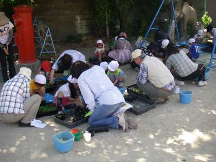 地域の方が9名応援に駆けつけてきてくださいました。「よろしくお願いします」先生から根を切らさないよう丁寧に植え替えてくださいね,というお話を聞いてグループに分かれてしました。「子ども達は集中して上手に植え替えたよ」と応援に来られた地域の方々から褒めてもらいました。