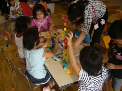年中さんは七夕の飾り作りをしました。「先生できました」「もう1つ紺色にしようかな」だんだん大きくなったり綺麗になっていく自分の飾りを見ていろいろな言葉が出ます。