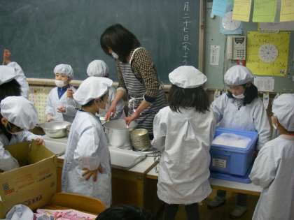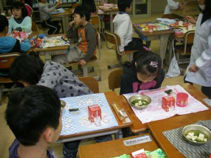 いよいよ待ちに待った給食です。配膳をしてもらって「ちらしずしありますか?菜の花おすましありますか?三色ゼリーはありますか?・・」「いただきます」