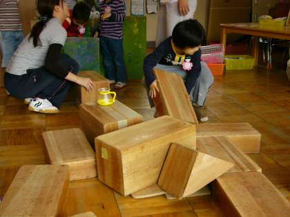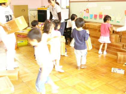 にじ組(年中さん)は,積み木遊びの後みんなでお片付けですよ。「よいしょ,よいしょ」早く片付いてきたね。