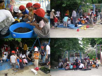6月19日(水)花の苗屋さんへ向けて,年長組さんは苗の植え替えをしました。地域の方が8名,応援に駆けつけてくれました。「お願いします」「こちらこそ,お願いします」地域の方がにこにこして応えました。