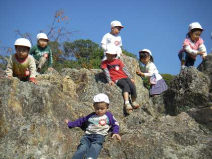 友だちと手をつないで幼稚園から船岡山まで歩いて遠足にでかけました。頂上に行く途中でどんぐりを見つけたり,頂上では「京都タワーはどこかな?」「大文字も見える」と山の上からの景色を楽しんだりしました。山の途中の岩場を気に入りのぼったり,おりたり繰り返し遊びました。みんなでお弁当を食べ,帰りはバスに乗って幼稚園に到着。まだまだ遊び足りない姿も見られました。遠足が大好きなひかり組です。
