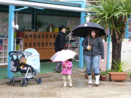 毎日の登園の送りご苦労さまです。特に今日のように寒い雨の日は大変です。赤ちゃんも妹もみんなで幼稚園まで送ってくれます。雨の中どうもありがとう。先生や友だちのお母さんと子どものお話をして情報を交流します。