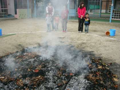 お母さんたちが朝から手伝いに来てくださいました。火を大きく燃やした後,オキと灰にしてアルミで包んだサツマイモを入れます。その上に落ち葉を乗せて焼き芋。「1時間ほどたったよ。何かいいにおいがしませんか?」「・・・」