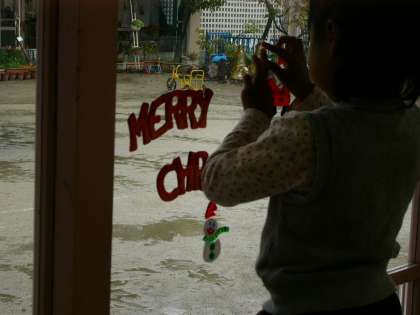 ガラスにも飾りつけをします。「一人ずつ付けてね」「今度はこれをお願い」